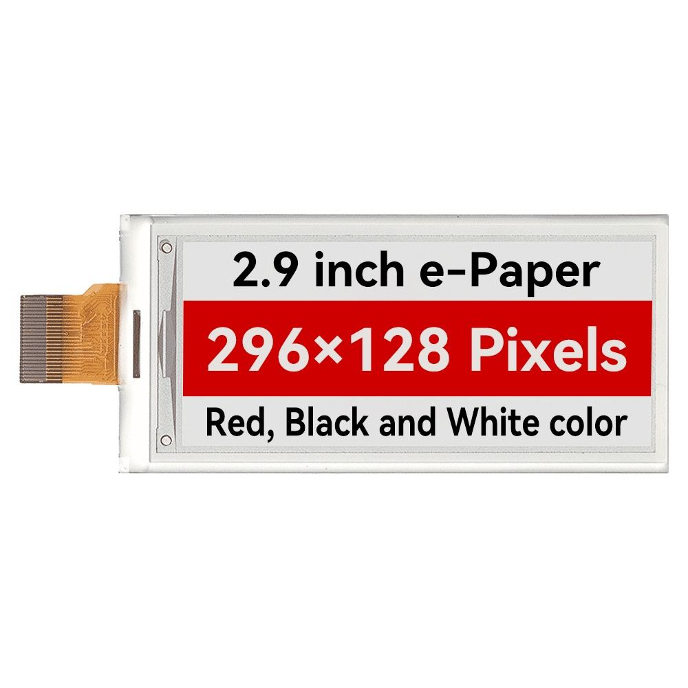 2.9" E-paper display supports black, white, yellow, and red images, depending on the associated lookup table used. With a 2.9 inch E-paper module featuring a 128×296 pixel active area, this display offers superior color contrast and visibility. The integrated circuitry includes a gate and source driver, timing controller, oscillator, DC-DC boost circuit, memory for storing frame buffers and lookup tables, as well as additional circuitry for VCOM and BORDER control.