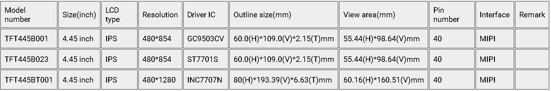 4.45英寸TFT液晶显示模块是一款具有480xRGBx854像素的彩色TFT液晶显示模块。目前,该液晶显示模块有两种不同的版本。