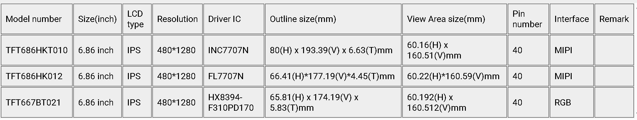 6.86英寸IPS液晶显示屏,MIPI接口,分辨率:480x1280,亮度:400,驱动芯片FL7707N