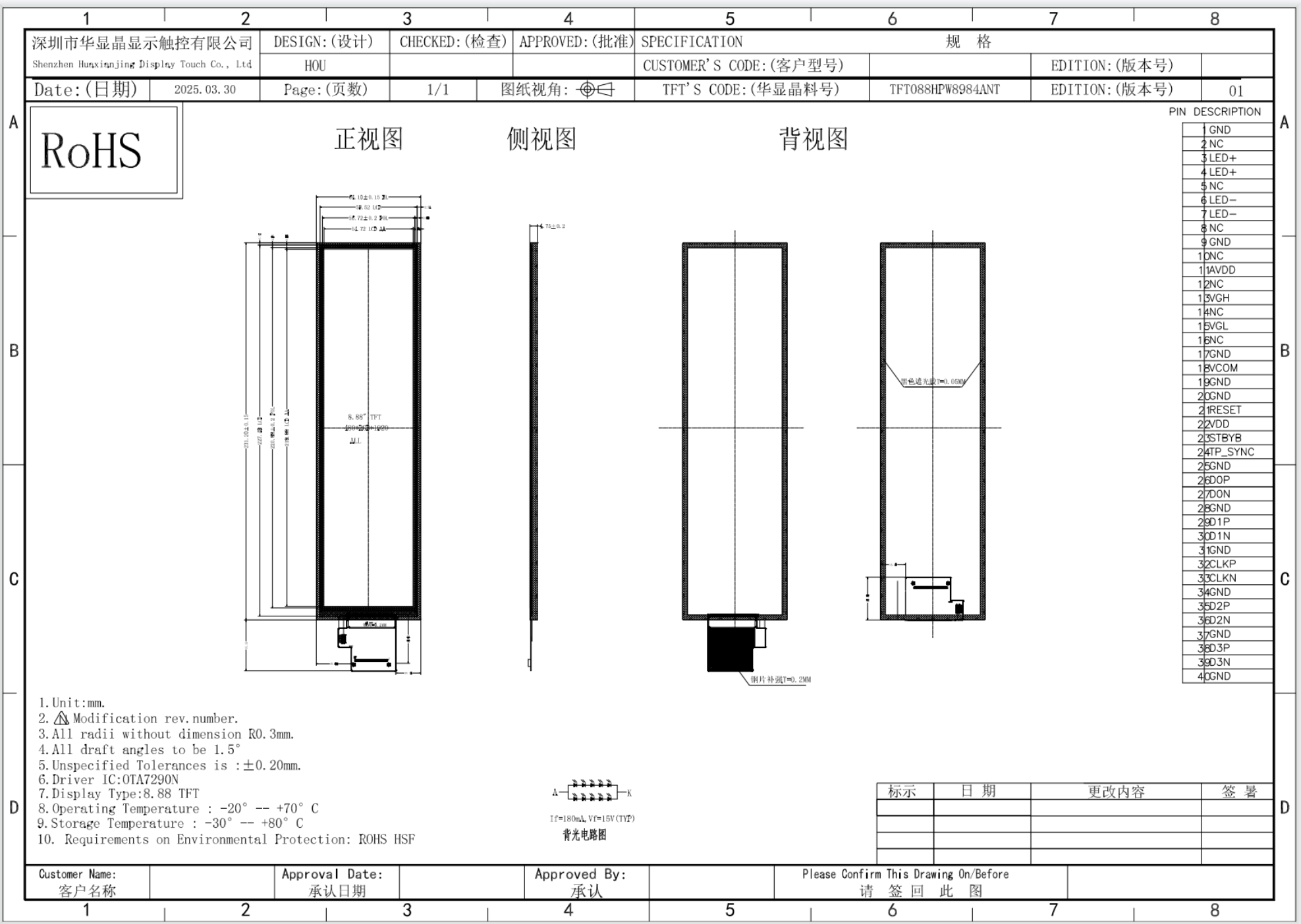 8.8英寸IPS液晶显示屏,MIPI接口,分辨率:480x1920,亮度:400,驱动芯片OTA7290N