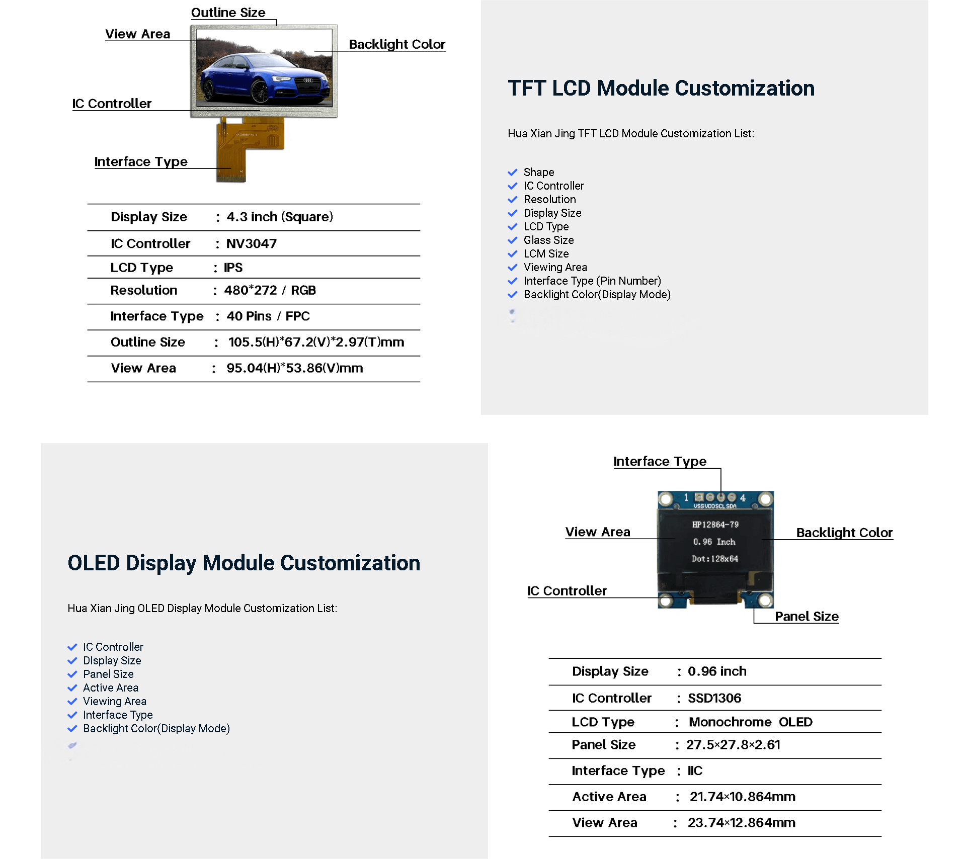 Except the available standard LCD/TFT/OLED display products, Huaxianjing provides tailor made displays. The extensive portfolio makes it possible to create tailor-made solutions for customers to fit their application. We have the advanced display technologies available to use in your design and if there is anything you want to change about one of our existing LCD/TFT/OLED displays, we can make it happen. With more than 15 years experience, our sales and engineering team will be with you through the entire development process and will ensure the semi or fully customization a successful display tailored made to the individual application.